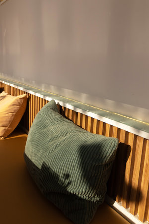 A green corduroy pillow on modern wooden slat bench with warm light and cozy atmosphere