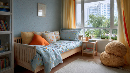 This image features a cozy children's room illuminated by natural light. A plush sofa with colorful cushions is complemented by vibrant curtains and a stylish bookshelf.