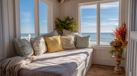 Inviting beach house window nook overlooking the calm blue sea, perfect for relaxation.