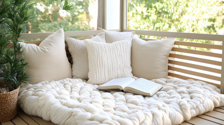 A Cozy corner with soft throw, pillows, and inviting book for relaxation