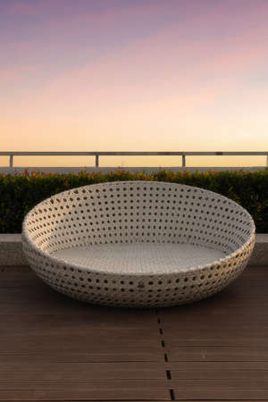 Relax corner on condominium rooftop garden with chairs in the morning, Bangkok, Thailand
