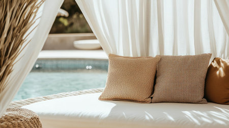Breezy white cabana curtains sway as warm sun lights up a cozy poolside escape with soft cushions