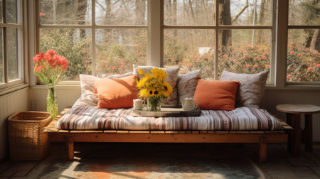 a sunroom bed, in the style of yellow and orange, sits beside the window. emotionally complex, with floral accents and eco-friendly craftsmanship, this bed embodies classic americana. the sunrays shine upon it, creating a warm and inviting atmosphere. captured with a graflex speed graphic, this photo showcases the beauty and charm of this unique piece of furniture. ai generated