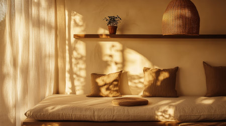 A serene indoor space featuring soft textures, warm tones, and gentle sunlight creating beautiful shadows, ideal for relaxation and tranquil living. Perfect for aesthetic home settings.