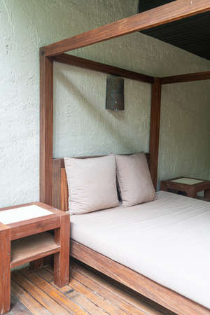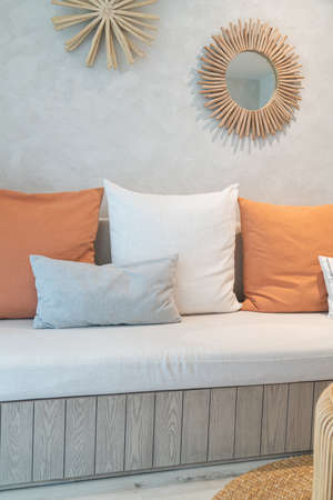 Close up of yellow fabric sofa and cushions decorate in tropical resort