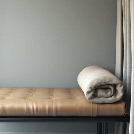 A cozy setting features a rolled blanket resting on a soft leather bench by the window.