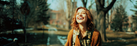 A young woman is seen laughing and enjoying a sunny day in a park, surrounded by trees and greenery, capturing the joy of early spring.
