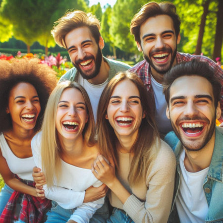 A group of young adults is captured outdoors, sharing laughter and joy. The image displays a diverse collection of individuals, their faces illuminated by smiles. The composition features soft lighting and a blurred background, suggesting a casual and relaxed atmosphere. This image is suitable for various commercial and editorial applications.