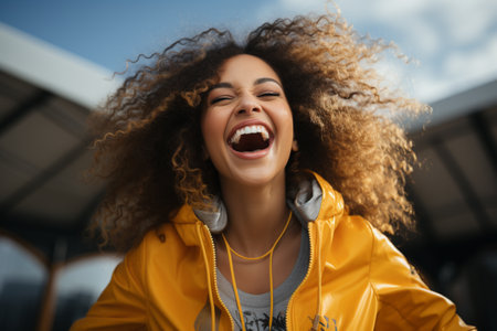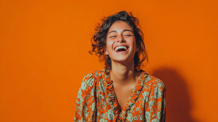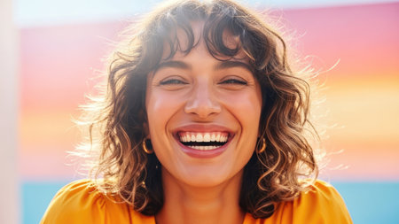 A woman is shown smiling with joy. The image features warm tones and natural light, with a focus on her facial expression. The colorful background adds vibrancy. This image is suitable for various commercial uses, illustrating themes of happiness and well-being.