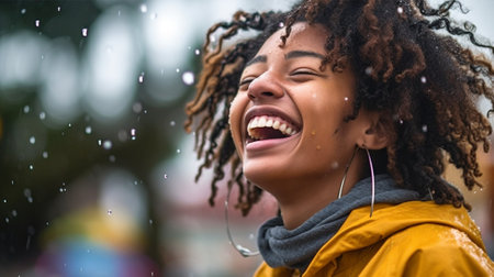 Generative AI : Cheerful ethnic female with yellow umbrella laughs and smiles with closed eyes on rainy autumn day on blue background