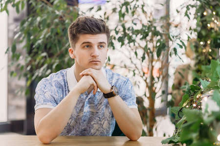 Top view of a young man with space for text and symbols on the old wooden background. Concept for confusion, brainstorming and choice.