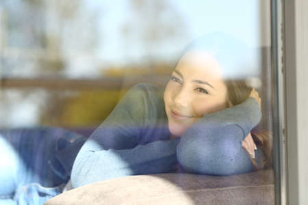 Close-up portrait of happy young woman resting and daydreaming at home, shot through window.