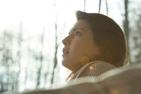 sad woman looking out the window close-up