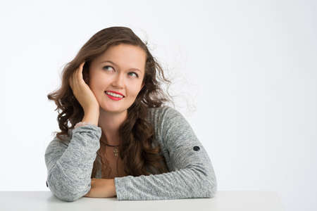 Beautiful woman sitting daydreaming resting her head on her hand staring up to the side with a faraway pensive expression over a white background