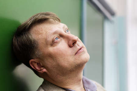Thoughtful man with glasses looking up against blue background