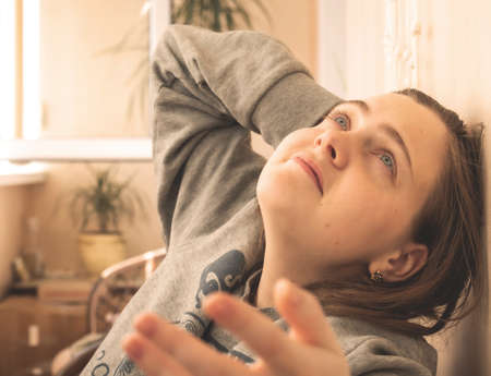 Young bored millennial woman looking at window alone at home. Fatigue or emotionally exhausted concept