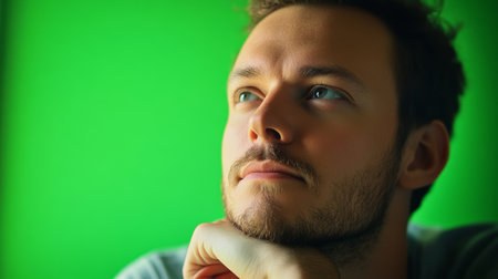 A thoughtful expression with a slight tilt of the head complements the bright green setting
