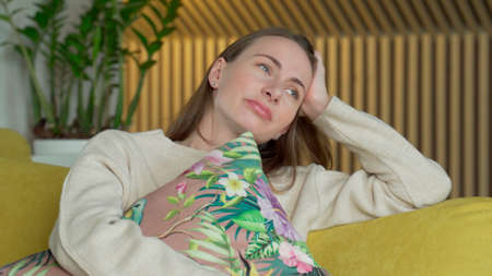 Unhappy lonely depressed woman at home, she is sitting on the yellow couch