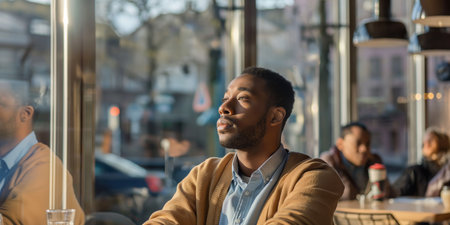 Man Enjoying Sunlight in Cozy Cafe, Reflective Urban Moment.