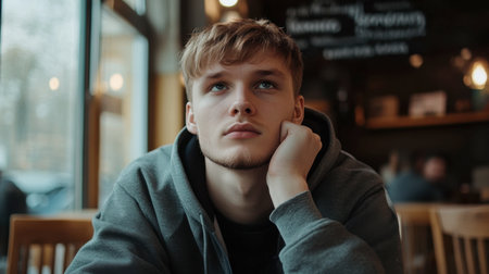 Man reflects thoughtfully while relaxing in a warm cafe atmosphere, enjoying the serene moment.