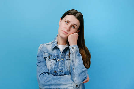 Lazy unhappy young woman isolated on blue studio background standing leaning on hand, looking at camera with bored indifferent expression, exhausted of tedious communication. People emotion concept