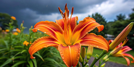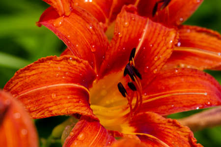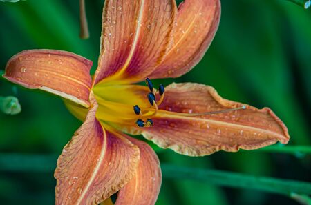 Beautiful bright orange day-lily with water drops on a rainy summer day