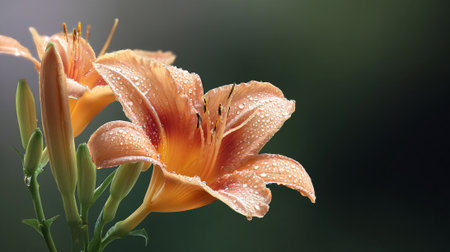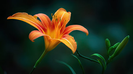 Orange lily flower on dark green background with copy space for text