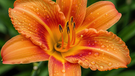 Macro of orange lily with water droplets on petals