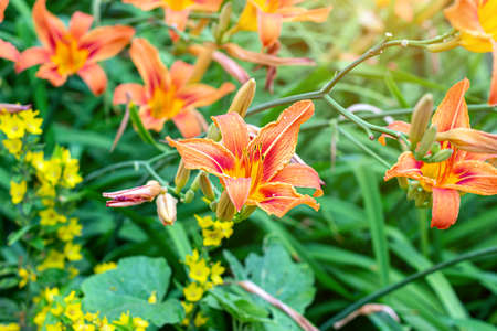 Beautiful blooming orange daylily (Hemerocallis fulva) in the garden