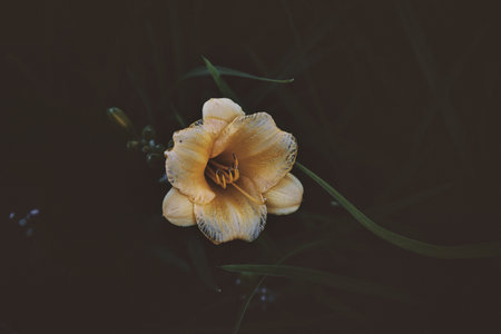 A soft yellow daylily stands out against a dark, muted background