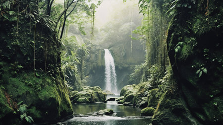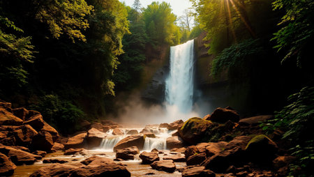 the essentialness of a astonishing waterfall since it bounced down cruel cliffs, making a dim appear. Creative resource, AI Generated
