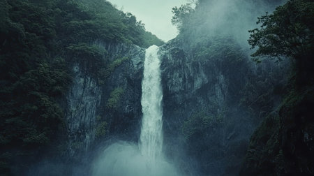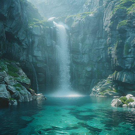 A captivating scene featuring a cascading waterfall surrounded by misty rocks, evoking peace and serenity in a breathtaking natural landscape. Perfect for nature lovers and tranquil settings.