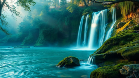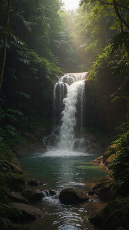 Experience the stunning beauty of a serene waterfall cascading through a lush green forest under soft morning light, creating a tranquil atmosphere in nature.