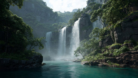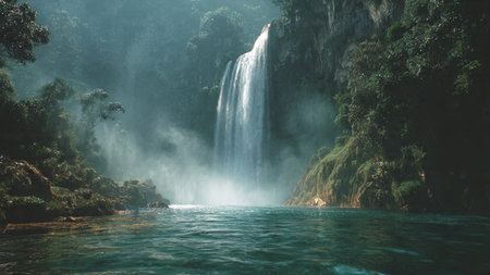 A breathtaking waterfall tumbles dramatically from towering cliffs, creating a misty spray that dances in the sunlight. Lush greenery frames this natural wonder, inviting tranquility.