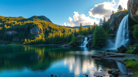 AI Generated. A beautiful landscape with a large body of water and a waterfall