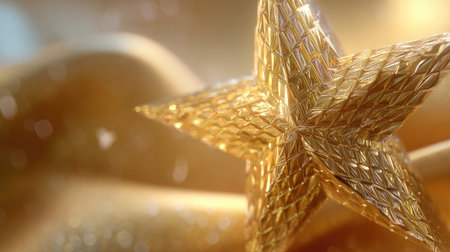Close-up of a shimmering golden star decoration set against a soft light background, highlighting its intricate textures and radiant sparkle. Perfect for festive themes.