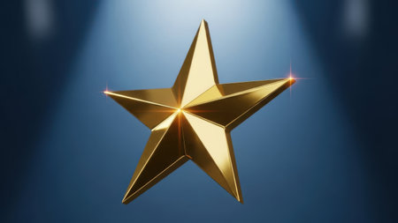A three-dimensional golden star with a reflective surface shines brightly against a dark, blurred background. The star's facets catch the light, creating a dazzling effect that highlights its geometric precision and elegance.