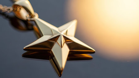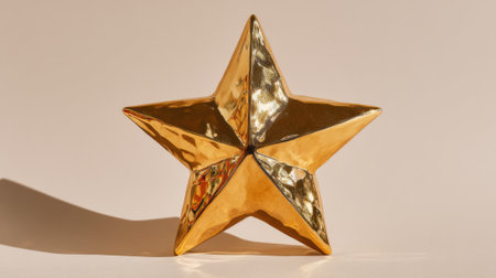 A golden star trophy standing proudly on a reflective surface, lit by soft golden light
