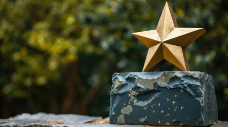 A golden star trophy standing on a rugged stone base