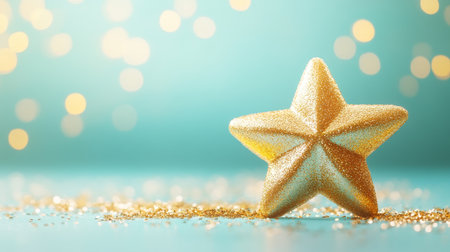 Sparkling Gold Star on Icy Blue Background with Shimmering Golden Bokeh for Christmas or Celebration