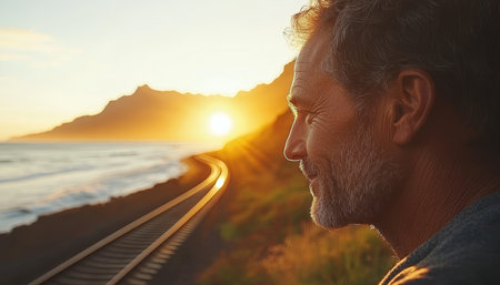 Contemplative Senior Man, Ocean Vista, Sunset, Railroad Tracks Symbolism, New Beginnings