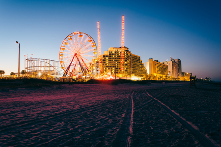 Tire tracks on the beach, rides and hotels at night, in Daytona Beach, Florida.