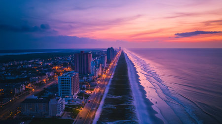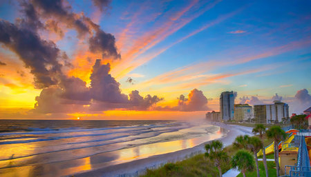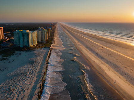 Florida, USA - Feb. 11, 2021: Scenic Daytona beach coastline with buildings at sunset