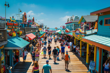 A crowd of people walking down a bustling wooden walkway lined with colorful shops, A bustling boardwalk lined with colorful shops and lively street performers
