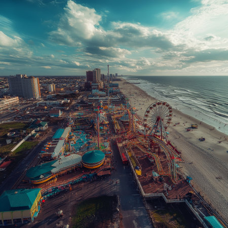 Daytona Beach Main Street Pier panorama aerial view in a cloudy day, Daytona Beach, Florida FL, USA.