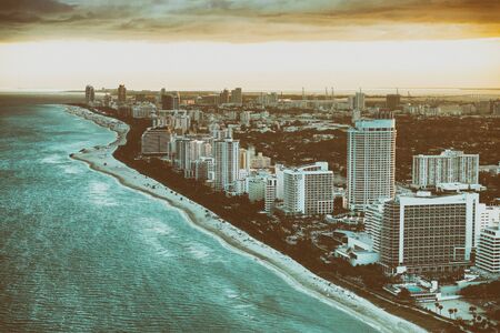 Amazing skyline of Miami Beach. Aerial view of city buildings from helicopter on a cloudy sunset.