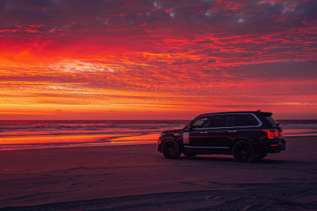 A black car is parked on a beach at sunset. The sky is orange and the water is calm