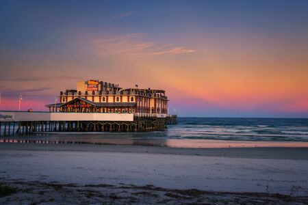 Sunset above Daytona Beach Main Street Pier With Joes Crab Shack restaurant