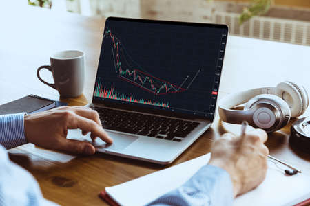 Analyzing. Man working home during coronavirus or COVID-19 quarantine, remote office concept. Young boss, manager in front of laptop screen during analyzing graphs, statistics. Close up hands.