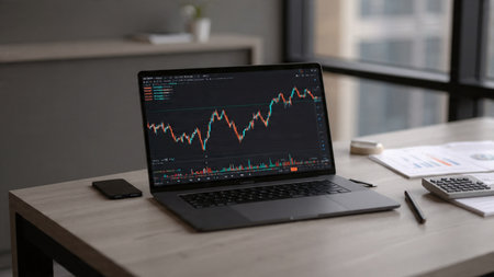 Real-time trading charts glow on a sleek laptop screen placed next to reports and a steaming coffee on a wooden desk.